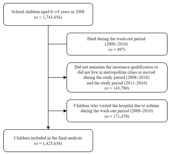 South Korea is covered by the national health insurance service (NHIS), a single-payer health insurance service. It almost covers the entire population (over 97%) in South Korea. A detailed explanation of NHIS was published previously [11]. Using NHIS customized data in South Korea, we constructed a retrospective cohort for children living in seven metropolitan cities (Seoul, Busan, Daegu, Incheon, Gwangju, Daejeon, and Ulsan) with a 3-year wash-out period (2008–2010) and 6-year follow-up period (2011–2016). We selected study participants aged 6 to 14 years in 2011, the baseline year of the follow-up period. Due to the uncertainty of the diagnosis of asthma in children under 5 years of age [12], we focused on school-aged children over 6 years of age. Customized data on the following parameters were recorded: outpatient visit, hospitalization date, primary and secondary diagnostic codes, age, sex, household income, district-level address, cause of death, and date of death.