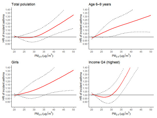 Figure 3 shows the exposure-response curves of the 48-month moving average PM2.5 exposure and the HR of asthma incidence. While analyzing the total population, when the exposure range was over 30 µg/m3, the HRs of asthma incidence increased linearly. In the 6–9-year age group and girls, the HRs of asthma incidence increased linearly over the entire exposure range. In the fourth quartile of the household income group, the HR of asthma incidence increased linearly when the exposure range was over 26 µg/m3.
