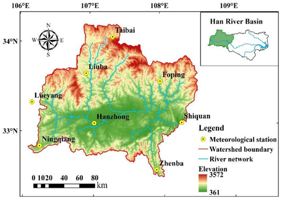 The Han River originates from Ningqiang County, Shaanxi Province of China. The study area is the upstream of Shiquan Hydrological Station in Han River (hereafter named the upper reach of Han River). The upper reach of Han River is located at 106°09′~108°52′ E and 32°45′~34°02′ N, and the catchment area is about 23,750 km2 [38]. The study area is shown in Figure 1.