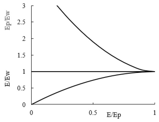 The AA model is the most widely used complementary linear evapotranspiration model. It calculates the potential evapotranspiration through the Penman formula and the humid environment evapotranspiration through the Priestly–Taylor formula. Han et al. [30] carried out dimensionlessization of various complementary evapotranspiration models, and first proposed a nonlinear sigmoid function based on the principle of complementary evapotranspiration (H2012), which corrected the deviation of the AA model under dry and humid conditions. Inspired by the nonlinear complementary model proposed by Han et al. [30], Brutsaert et al. [31] also extended the evapotranspiration complementary relationship model to a dimensionless form , let ,. At the same time, he defined as the actual evapotranspiration, mm/d; is the potential evapotranspiration, mm/d; is the wet environment evapotranspiration rate, mm/d. Use a power function to represent the relationship between and , represent the coefficients in the polynomial.