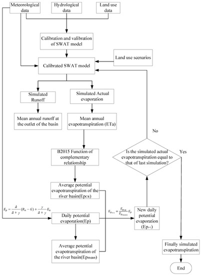 The modeling framework of iterative calculation of the SWAT model coupled with the evapotranspiration complementary relationship.