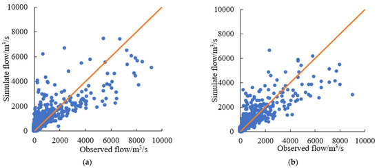 Simulated daily flow at Shiquan hydrologic station in the calibration and validation periods: (a) calibration period; (b) validation period.