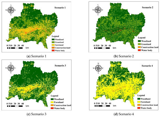 In order to evaluate the simulation result of the CA–Markov model in the study area, the land-use data in 1980 and 1995 were used in the CA–Markov model to simulate the land use in 2010. The simulated land use was compared with the actual land-use map in 2010 to evaluate the simulated result. Generally, the Kappa coefficient is used to evaluate the accuracy of remote sensing data spatial simulation, the Kappa coefficient of the land-use map in 2010 and simulated by the CA–Markov model was 0.91, indicating that the model simulation has high prediction accuracy and can be used to simulate and predict land use in 2025. Therefore, the land use of the study area in 2025 was simulated and predicted, which is Scenario 1. The results showed that the woodland increased by 14 km2, the farmland decreased by 123 km2, the grassland increased by 18 km2, the construction land increased by 64 km2, and the water area increased by 27 km2.