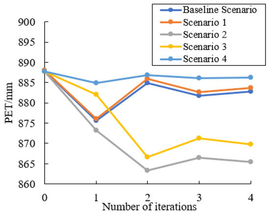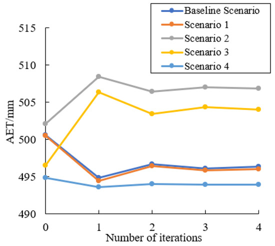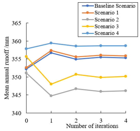 Mean annual potential evaporation and mean annual evapotranspiration after multiple iterations in four scenarios are shown in Table 7 and Table 8. The PET in the final simulation was smaller than the PET in the initial simulation in the four scenarios we set up earlier.The AET in the final simulation was smaller than the PET in the initial simulation in the baseline scenario, Scenario 1, and Scenario 4, and was larger in Scenarios 2 and 3. The changes of the PET of every iteration under different scenarios are shown in Figure 7, and the changes of AET of every iteration under different scenarios are shown in Figure 8.