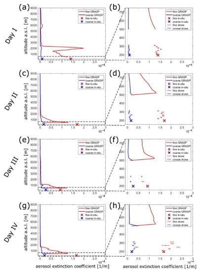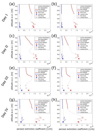 Aerosol extinction obtained from GRASP (LIDAR and sunphotometer data), in-situ particle size distribution supported by Mie theory (SMPS and APS data), and UAV-based optical particle counting (OPC data normalized to APS+SMPS derived values at the ground). The left-hand side plots (a,c,e,g) depict the full height of the profiles throughout the troposphere while the values near the ground are depicted on the zoomed-in right-side plots (b,d,f,h). Moreover, drone measurements with corresponding standard deviations are included in these zoomed-in subplots.
