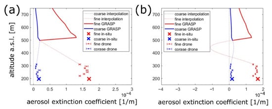 The data denial experiment was included in this analysis to study how the additional information provided by UAV measurements enhances the overall extinction retrievals. When compared to ground-based in-situ observations alone, the utilization of airborne OPCs provides not only information on the approximate structure of aerosol extinction in the lowermost 120 m of the atmosphere but also allows for calculating a profile’s derivative at the lower boundary of the interpolation region. The results presented in Figure 4 suggest that without drone data the extinction profiles tend to fall rapidly with height approximately within the first 100 m of the atmosphere while larger values are present higher in the GRASP profile range. The addition of UAV data results in more aerosols being represented close to the ground while the profile is renormalized to lower values in the higher troposphere. Our method exhibits slightly different behaviour in the case of day I, where the GRASP profile seems to be in better agreement with the surface values before the normalization. Although the high altitude values do not vary significantly in this case, more aerosol layers are visible thus giving additional information on the aerosol structure. In the combined regions of UAV and interpolation, there are two distinct aerosol layers visible (at approximately 250 m and 450 m) while there is rather constant aerosol extinction visible in the solution without OPC data. The results of this data denial analysis indicate that UAV data is important, if not crucial, for studying the structure of aerosol extinction near the ground, where the highest variability is often found.