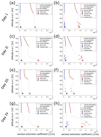 The presented results show that the reconstruction of closed (complete) and normalized profiles of fine and coarse aerosol extinction, based on the synergy of remote, in-situ, and airborne measurement platforms, is feasible. The proposed utilization of analytical functions (in this case polynomials) coupled with the incorporation of not only values but also respective trends (derivatives with respect to altitude) at the boundaries of the interpolation region, provides smooth and stable solutions. The differences between GRASP profiles before and after the renormalization have proven to be significant (up to a factor of 1.8) in three of the investigated cases, i.e., days II, III, and IV. This is the result of a mismatch between the lowest GRASP value (representative for the lowermost part of the atmosphere, down to the surface) and the values obtained near the ground with in-situ and UAV measurements. This can be a result of prohibiting the algorithm from allocating aerosol load in the stratosphere (one of the assumptions we made in our GRASP retrievals) resulting in an overestimation of extinction in the LIDAR operational range. Such an overestimation would automatically result in an underestimation of aerosol load near the ground as the integral of the complete extinction profile is normalized to AOD. Fortunately, the method proposed in this work can overcome this problem by renormalizing the GRASP profile and thus restoring the correspondence between high and low-altitude extinction retrievals. On the day I the lowermost value in the GRASP profile was not significantly different from the neighbouring values and was similar to the values obtained near the ground, thus the renormalization did not change the profile significantly (see Figure 3a,b).