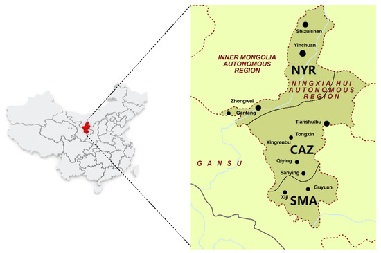 Ningxia is located in northwestern China. It is bordered by Shaanxi, Inner Mongolia, and Gansu. It has five prefecture-level cities, namely, Yinchuan, Shizuishan, Wuzhong, Guyuan, and Zhongwei. Ningxia is far from the ocean and is located inland, forming a more typical continental climate, with the characteristics of long winter coldness, short summer heat, warm spring, and early autumn; drought and little rainfall, sufficient sunshine, strong evaporation, wind, and sand; cool south and warm north, wet and dry south, and more meteorological disasters. The geographical location of the Ningxia Hui Autonomous Region on the map of China and the distribution of sites in the Ningxia area are shown in Figure 1. The red area on the left shows the geographical location of the Ningxia Hui Autonomous Region in China, and on the right is the distribution map of topographic and meteorological stations in the Ningxia Hui Autonomous Region.in the map. NYR represents the northern Yellow River, CAZ represents the central arid zone, and SMA represents the southern mountainous area. The three cities of Shizuishan, Yinchuan, and Zhongwei are distributed in NYR District, Wuzhong City is distributed in CAZ District, and Guyuan City is distributed in SMA District.