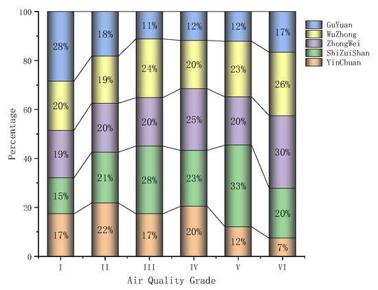 - Statistical analysis of the data shows that the overall indicators of Guyuan are better than those of the other four cities, and the worst is Shizuishan City, which has a clear correlation with the geographical location of the municipal areas, and the overall air quality in the southern mountainous areas is better than that of the Yellow River irrigation area in the north.