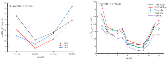 The monthly statistics of PM2.5 concentration data in five cities from 2018 to 2020 were carried out. The average value of PM2.5 in each city in three years was calculated according to the month, and the statistical data were drawn as the line graph of Figure 3b. It was found that the monthly variation trend of PM2.5 concentration was obvious. A monthly downward trend began in January until the lowest in June–September, followed by a monthly upward trend from September. It further illustrates the seasonal variation of PM2.5 concentrations, with the lowest in summer and the highest in winter. First, since coal burning in winter is the main method of household heating and energy supply, this has a strong correlation with the soot emitted by coal and gas or fuel oil during the winter heating process in Ningxia. Secondly, the spring and winter periods in Ningxia have greater wind and sandstorms, and wind disasters and sandstorms are affected by the terrain; generally, there are more Yellow River irrigation areas in the north and fewer mountainous areas in the south. Wind and sand will increase the concentration of PM2.5 in the atmosphere and make the air quality worse.