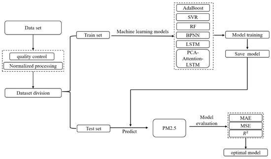 The experimental process of predicting PM2.5 concentration is shown in Figure 5, including data preprocessing, model construction, model prediction, and analysis. Firstly, the experimental data are preprocessed and normalized, and the data are divided into training set and test set. Secondly, the training set is used to train multiple machine learning models and save them. Finally, the prediction values of each model for PM2.5 concentration are obtained by the test set, and the experimental results are compared and analyzed by the evaluation method. The specific process is as follows: