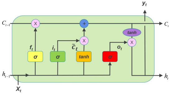 The input gate determines the retention of the input information by judging the importance of the current input information, which determines how much new information is added to the cell state, a sigmoid layer determines that the information needs to be updated, and a tanh layer generates a vector, that is, the alternative content used to update, merging the two parts to update the cell state. The output gate runs a sigmoid layer to determine the part of the cell state that will be exported, and then the cell state is processed by tanh to obtain a value between −1 and 1, and it is multiplied by the output of the sigmoid gate to obtain the output result. The symbols in the figure are calculated as follows: