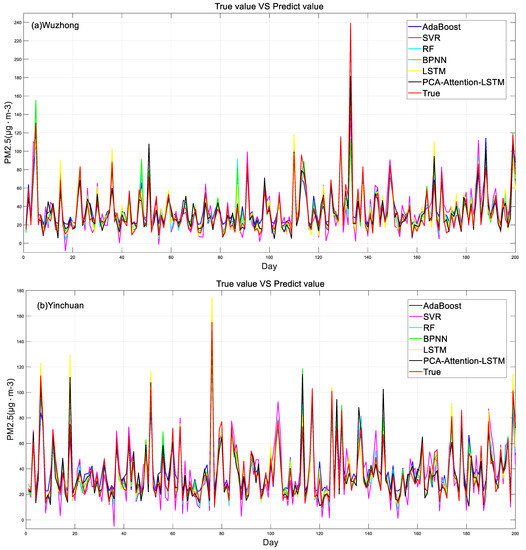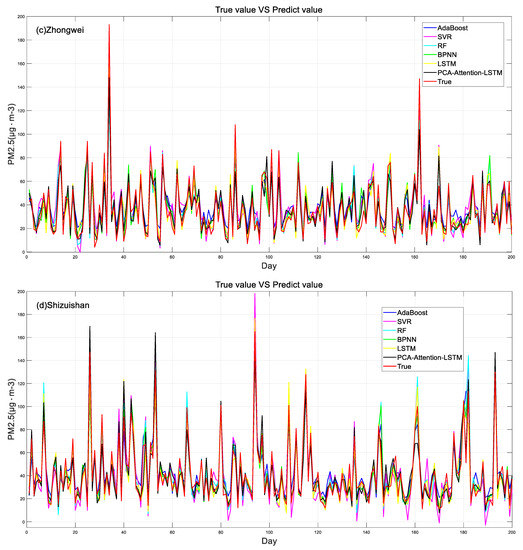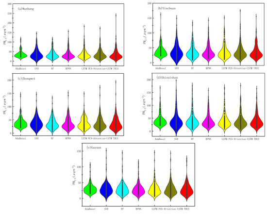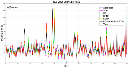 In order to further compare the relationship between the predicted values and the measured values of the six models, Figure 9 compares the true values of PM2.5 concentrations in five municipal areas with the predicted values of the models. It can be seen from Figure 9 that the AdaBoost model in the Wuzhong area as a whole shows an overestimation phenomenon, SVR and RF show an underestimation phenomenon, and the distribution of the PCA-attention-LSTM model and true values is the closest, but the peak is underestimated. The AdaBoost model in Yinchuan showed an overall overestimation phenomenon, the SVR showed an underestimation phenomenon, and the PCA-attention-LSTM model and the LSTM model were close to the distribution of the measured values. The LSTM model, BPNN model, and AdaBoost model in Zhongwei area showed an overall overestimation phenomenon, the RF model showed an underestimation phenomenon, and the PCA-attention-LSTM model was close to the overall distribution of the measured values but the peak was underestimated. The Shizuishan area and the AdaBoost model as a whole showed an overestimation phenomenon, the SVR and RF models showed an underestimation phenomenon, and the range of predicted values became larger, and the PCA-attention-LSTM model and LSTM model were close to the overall distribution of the measured values. The AdaBoost model in the Guyuan area showed an overall overestimation phenomenon, and the PCA-attention-LSTM model was closest to the overall distribution of the measured values.