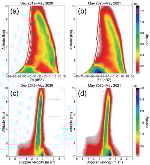 Contoured frequency by altitude diagrams (CFADs) of reflectivity (, dBZ) (a,b) and Doppler velocity (v, m s) (c,d) for Dec 2019–May 2020 (a,c) and May 2020–May 2021 (b,d). These two periods correspond to the two chirp sequences described in Table 2 used during the study period. The probability density as a percentage is shaded according to the scale.