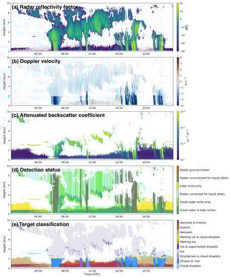 Time series of (a) radar reflectivity factor (dBZ), (b) Doppler velocity (m s), (c) attenuated backscatter coefficient (sr m), (d) detection status, and (e) target classification based on the Cloudnet algorithm for 29 May 2020 between 0000 UTC and 2359 UTC. (Source https://cloudnet.fmi.fi,], accessed on 6 December 2021).