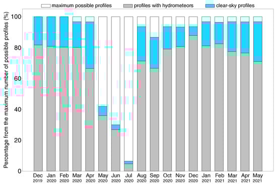 Data availability for the Bucharest–Măgurele station between December 2019 and May 2021. White bars represent the maximum possible number of vertical profiles for each month. The grey bars represent the number of profiles with hydrometeors, and the blue bars represent the number of clear-sky profiles (as a percentage of the total number of possible profiles).