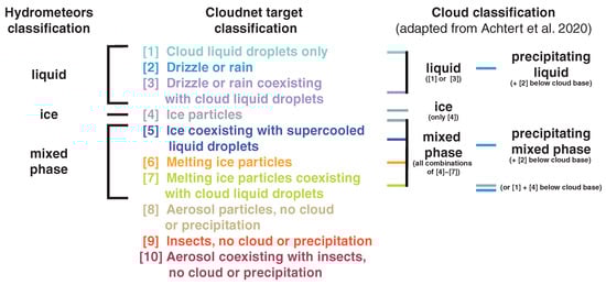 The Cloudnet target classification and the hydrometeors and cloud classification used in this study. The cloud classification is adapted from [].