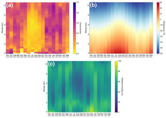 The mean monthly occurrence of cloud fraction from ECWMF-IFS shows high values over the entire column between Nov 2020 and Mar 2021 (Figure 7a). The annual cycle of temperature is characteristic of northern hemisphere mid-latitudes (Figure 7b). Close to the surface (<100 m in altitude), the lowest values for mean monthly temperature occurred in Jan 2020 (0.8 C), and the highest value occurred in Aug 2020 (25.1 C) (Figure 7b). At 5.5 km in altitude, the mean monthly temperature varied between −31.8 C in Mar 2021 and −15.6 C in Aug 2020. Relative humidity (with respect to water for temperatures above 0 C, with respect to ice for temperatures below 0 C) is shown in Figure 7c, and here, it should be noted that since the cloud physics scheme in a forecast model will generate clouds at relative humidities lower than the saturation value of 100%, a strong correlation between RH and clouds is not expected since the cloud physics scheme will also be taking into account other sub-gridscale processes (e.g., vertical motion). Close to the surface, the highest values of RH occurred during the winter months. In general, RH at low levels depends on the properties of the active surface layer []. High values of RH at upper levels (7–10 km) are associated with advection due to tropospheric circulations, such as moisture advection from the Mediterranean Sea [].