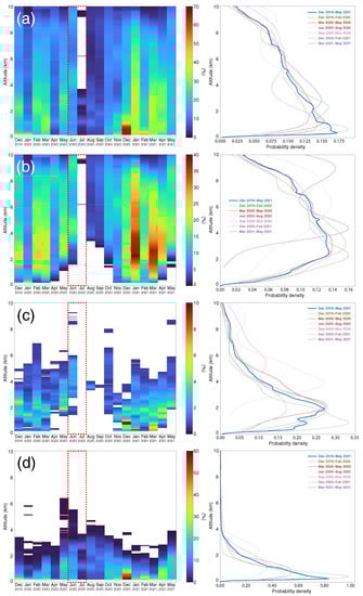 Frequency of occurrence for (a) liquid, mixed-phase and ice hydrometeors, (b) ice hydrometeors, (c) mixed-phase hydrometeors, and (d) liquid hydrometeors identified using the method proposed by [] and based on target classification data from Cloudnet. The values are normalised to the total number of profiles for each month. The red dotted rectangle indicates the months with incomplete data (as shown in Figure 5). Left panels show the monthly distribution by altitude, and the right panels show the seasonal distribution by altitude.
