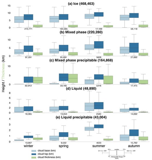 The seasonal occurrence of (a) ice, (b) mixed-phase, (c) mixed-phase precipitable, (d) liquid, and (e) liquid precipitable cloud as observed by the Bucharest–Măgurele Cloudnet station between Dec 2019 and May 2021. For each season, the distribution of cloud base height (in km, light blue), cloud top height (in km, blue), and cloud thickness (km, green) is presented as a box-and-whiskers plot. The number in each panel represents the total number of profiles for the type of cloud and for each season. Note that the data from summer and autumn are collected for one year, and for winter and spring, the data are collected for two years.