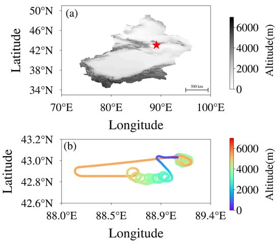 (a) The map of the observation site. (b) The flight trajectory of Kingair aircraft. The red stars represent the location of Turpan. (“Altitude” in this study all represent the altitude above mean sea level).