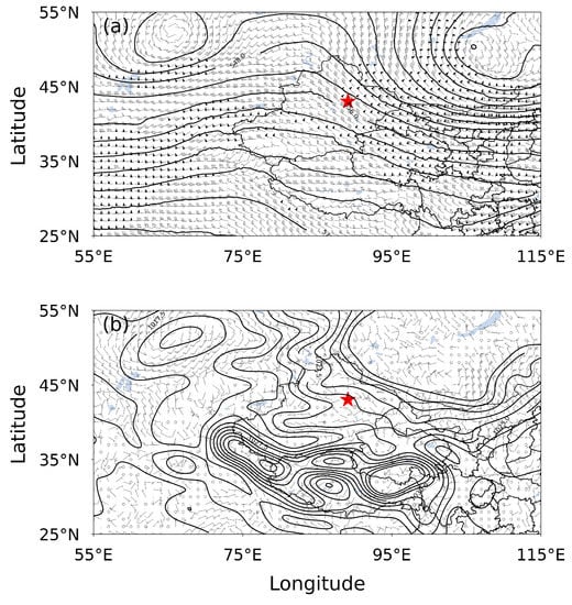 (a) The geopotential heights (plotted every ten geopotential meters) and wind field (m s) at 500 hPa, and (b) the pressure (hPa) and wind field at the surface, at 0:00 AM (UTC) on 29 December 2019. The red stars represent the location of Turpan.