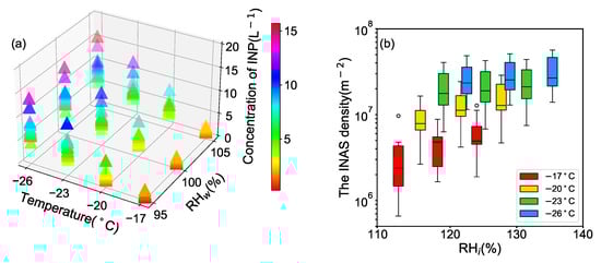 Temperature and humidity are the two main parameters that determine the activation of INPs. Figure 3a presents the changes of INP concentration under different humidities and temperatures. As expected from previous observations [,], the INP concentration increases with the decrease of temperature and the increase of relative humidity. Under all activation conditions, the mean INP concentration is 4.7 L and the maximum INP concentration reached 15.7 L .