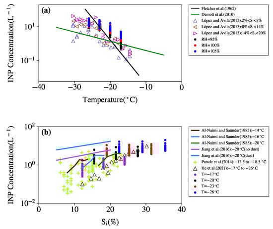 (a) The variations of INP concentration with temperature at different relative humidity. (b) The variations of INP concentration with relative humidity at different temperature. Some of the results obtained in previous studies are also shown for comparison [,,,,,,].