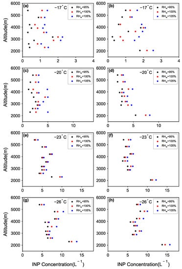 Compared with ground-based observations, few measurements focused on the vertical distribution of INP concentration. Figure 5 shows the change of the INP concentration with altitude. Due to different activation conditions, the concentration of INPs varies greatly with height. During the ascent of the aircraft, the maximum value is found at 2300 m, reaching 13.8 L at T = −26 °C, RH = 105% (Figure 5d). Except for 4000 to 5000 m, the vertical change of INPs concentration above 2300 m is not obvious, and the variation range is from 4.3 to 8.7 L at −26 °C. Under the activation conditions of lower temperature (−23 and −26 °C), INP concentration during aircraft descent stage is consistent with that of ascent stage. The maximum value reached 15.7 L, around 2000 m (Figure 5h). Similarly, above 2300 m, there are high values at 4000 to 5000 m compared with other altitudes.