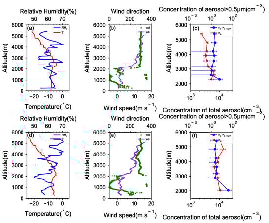 During the descent stage, from 1300 to 2300 m, the temperature increases with height (Figure 6d). The turning point of wind direction was 2100 m; below 2300 m was mainly easterly, and above 2300 m was westerly (Figure 6e). The lowest sampling height during the aircraft descent was 2040 m, similar to that during the ascent stage. At this height, the total aerosol concentration was relatively large, and the concentration of aerosol particles with a size larger than 0.5 m reached 20 cm, which is significantly larger than that above the PBL (Figure 6f).