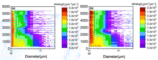 Figure 7 depicts the aerosol size distribution. Because the distance between the two phases of flight is relatively close, the changes of the spectral distribution of aerosol with altitude have a certain similarity. The concentration of fine-mode aerosol particles is very large. This is consistent with the investigation of Zheng et al. (2022) [] in winter in Xinjiang. Similar to the report of He et al. (2021), the aerosol concentration is higher in the low altitude. The aerosol concentration below 2300 m decreases with the increase of altitude, and particles larger than 0.5 m reached as high as 100 cm. Between 2300 m and 5500 m, aerosol concentration varies little with altitude, and is mainly composed of small particles (0.1–0.2 m). The concentration of aerosols larger than 0.5 m is less than 5 cm, and even have not been observed at some heights. Some aerosol larger than 0.5 m reported by He et al. (2021) [] were caused by the hygroscopic growth of aerosols near clouds. However, in this study, there were no clouds at all, and the relative humidity in the upper air is relatively low (RH < 71%) (Figure 6a,d). There are no larger aerosol particles caused by hygroscopic growth. The total aerosol concentration at high altitude during the descending phase of flight is higher than that in the ascent stage, especially the concentration of aerosol particles with small sizes. It may be because the descending phases is on the west side, and closer to Urumqi, a megacity. The pollution in this area is relatively serious [], and the westerly wind brings more aerosol particles to the sampling site.