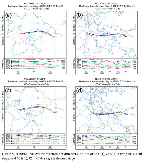 Affected by the northwest and northeast cyclones (Figure 2), westerly wind was dominant at the sampling height and in the descent stage (Figure 6). The source of air mass was calculated by the Hybrid Single-Particle Lagrangian Integrated Trajectory model (HYSPLIT) []. From the backward track of 36 and 72 h (Figure 8), the origin of air masses at the two sites is relatively consistent. The air masses at 2300 m and below (within the PBL) are transported from short distances and originate from the closer areas around the observation site. Under the action of westerly winds at high altitude, air masses above 2300 originate from long distance through the deserts of Central Asia. The air mass track also passes through Urumqi. In winter, due to coal and natural gas burning for heating in Urumqi, the secondary formation of fine particles occurs [,,]. Previous studies have shown that pollution aerosols are not good INPs [,]. However, other studies reported that pollution aerosols can act as INPs to increase the number of ice crystals in cirrus [,,]. Since the type of aerosols was not obtained in this experiment, it cannot be judged.