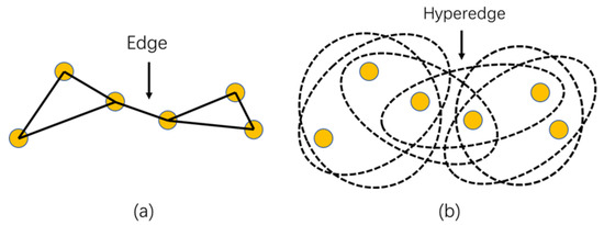 Since hypergraph theory is proposed, hypergraph learning has made promising progress in many applications in recent years, and the basic derivation idea of the Formulas (5)–(8) comes from [26,28,29]. As an extension to the classic graph, a hypergraph facilitates the representation of a data structure by capturing adjacent sample relationships in high order, which overcomes the limitation of a classic graph in that each edge only considers the affinity between pairwise samples. Unlike a classic graph, where a weighted edge links up two vertices, the hyperedge consists of several nodes in a certain neighborhood. Figure 1 is taken as an example of a classic graph and hypergraph.