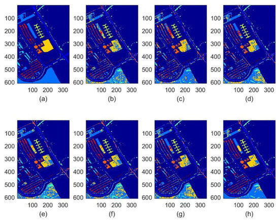 Classification maps for Pavia University. (a) Ground truth, (b) BH, (c) LDFA, (d) LPP, (e) NWFE, (f) PCA, (g) SH, (h) the proposed SDHE. The different colors indicate the different classes.