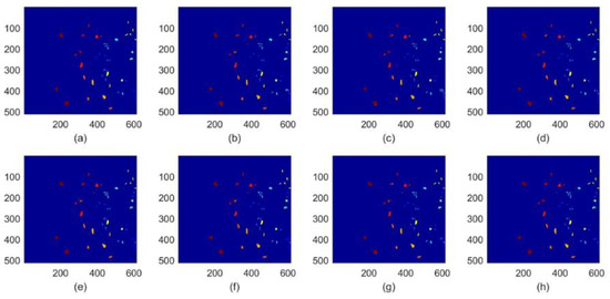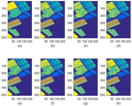 In order to present the classification effectiveness of different DR methods intuitively, the samples of testing set were given different pseudo labels, which were simulated by NN classifier after we conducted corresponding DR methods. Then, the results are portrayed via classification maps in Figure 4, Figure 5 and Figure 6. For each Figure, the subfigure (a) indicates the ground truth of original hyperspectral data set, the subfigure (b–h) indicates the performance of BH, LFDA, LPP, NWFE, PCA, SH and our proposed SDHE, respectively. The higher classification accuracy means the less miscellaneous samples in the corresponding subfigure, and the key points were highlighted by a white circle in subfigure (h) of Figure 4 and Figure 5. Obviously, there are less miscellaneous samples in our proposed SDHE in contrast to the others.