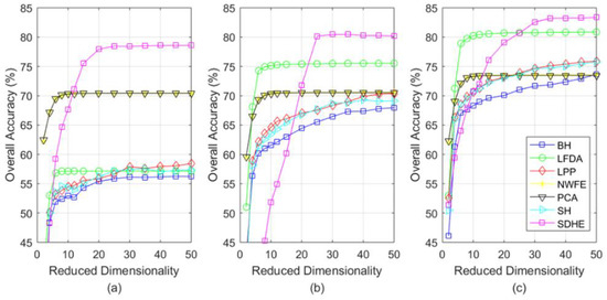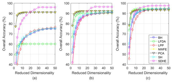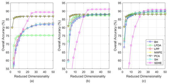 Besides considering the influence of reduced dimensionality on classification accuracy, Figure 7, Figure 8 and Figure 9 draw relevant curve figures according to the same training sets with their OAs of different DR methods listed in Table 7, Table 8 and Table 9. By adding the x-axis to denote the change of reduced dimensionality, the performances of different DR methods are depicted in Figure 7, Figure 8 and Figure 9. For each Figure, the subfigure (a–c) indicates the training set of 15, 20, or 25 samples per class, respectively.