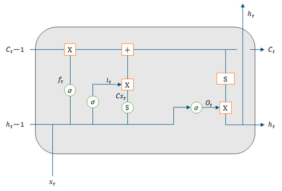 In an LSTM, the cell state acts as an internal selective memory of the past, represented in Figure 3 by the horizontal line starting at ct − 1 and ending at ct. The output of an LSTM cell is represented by h, i.e., the hidden state. The following equations depict the mathematical procedure of an LSTM cell: