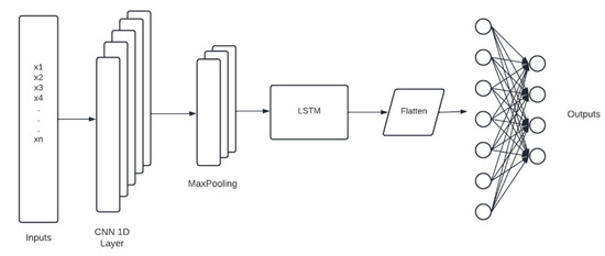 Hybrid models exploit the main functionalities of baseline methods, creating a more robust model that can handle more complex problems. In this sense, the CNN-LSTM method exploits the advantages of CNNs, extracting the most important multidimensional attributes from data, resizing them and sending them as input to the LSTM layers, which can extract more attributes related to temporal relationships. The combination of a CNN and LSTM is expected to deliver more reliable predictions. A representation of such an architecture is shown in Figure 5, with some internal layers that allow for connections between the parts. Thus, this architecture will be evaluated along with others models.