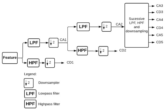 Despite the algebra involved in the process, the discrete wavelet transform (DWT) of a signal is calculated by multiple applications of high-pass and low-pass filters, as shown in Figure 6. The outputs from the former are detail coefficients, and those from the latter are approximation coefficients. The number of times that filters are used is determined by the level of decomposition required. The combination of the two outputs contains the same frequency content as the input signal, but the amount of data is doubled. Therefore, a downsampling procedure is applied to filter outputs, as shown in Figure 6 using a factor of two.