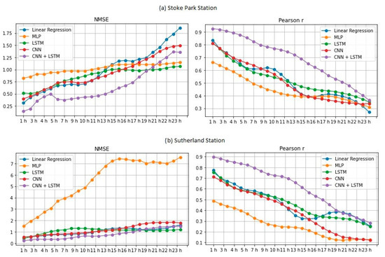 With respect to the NMSE for Stoke Park, the LSTM and MLP models outperformed the 1DCNN-LSTM model for last-hour forecasting, but 1DCNN-LSTM performed better for the overall forecasting hours, with a more consistent and robust performance than that of the other models, including for the Pearson r metric. However, for Sutherland Memorial Park, the MLP model presented the highest errors for the entire range for NMSE, whereas the 1DCNN-LSTM model achieved the best performance in almost all steps, except when LSTM slightly overcame its results for the last forecasting hours. Linear regression and MLP presented the worst performance in Stoke Park for NMSE and Pearson r, whereas MLP presented the worst results for Sutherland Memorial Park data for both metrics, followed by 1DCNN. For both datasets, the smallest error occurred in the first step, increasing along the forecasting horizon. This behavior occurs due to the decreasing ability of all methods with respect to longer-term forecasting, which reduces the capacity of the trained DNN models to make precise inferences about events in farther in the future. Therefore, the prediction performance decreases as the time horizon increases, making the metrics worse in the 24th hour. This also provides a basis for future research in the field of deep neural networks, with the aim of improving the ability of such models to learn and represent longer-term temporal relationships for multivariate time series forecasting. These results are related to a unique model trained for both stations at once.