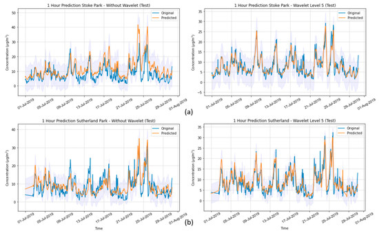 Comparison between the predictions of PM2.5 concentrations made with and without wavelets by 1DCNN-LSTM for the 24th hour for (a) Stoke Park Station and (b) Sutherland Memorial Park Station. The shadowed regions represent the prediction intervals of the model.