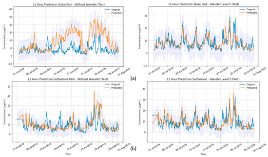 Comparison between the predictions of PM2.5 concentrations made with and without wavelets by 1DCNN-LSTM for the 12th hour for (a) Stoke Park Station and (b) Sutherland Memorial Park Station. The shadowed regions represent the prediction intervals of the model.
