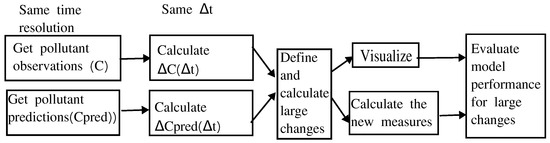 In this section, we define changes in pollutant levels (see Section 2.1), large pollutant level changes (see Section 2.2) and propose two new visualizations (see Section 2.3) and two new measures (see Section 2.4) for the evaluation of air quality models. Figure 1 represents the steps taken to get to the final model evaluation.