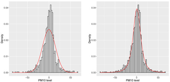 Fitting the normal (left) and t-distribution (right) on C(t) PM values from Ljubljana, Slovenia for the period 2014–2016.