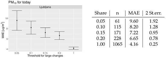 The first proposed evaluation measure based on the proposed visualization shown in Figure 3 is to calculate the MAE or the MSE only for the data lying outside of the predefined intervals. Figure 5 shows MAE with two standard errors for different shares of largest changes taken into account (from the upper 5% of the largest to the 20% of the largest C(t)) we can compare it to the same measure calculated for all values (see Figure 5). In our example (see Figure 5), MAE increases when we narrow the width of the observed intervals. MAE is the largest when only the most extreme changes are observed.