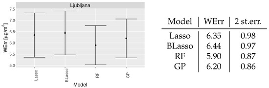 Figure on the left shows WErr with two standard errors for different models trained and tested on the same data (PM in Ljubljana) the used models are Lasso–L1-regularized regression, BLasso–Bayesian lasso, RF—random forest, GP—Gaussian process. The table on the right shows the numerical values (WErr—calculated as described in Equation (3), 2 st. err—two standard errors).