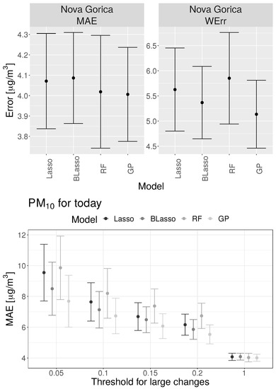 Figure 7 shows the comparison of the performances of the lasso (Lasso) [48], Bayesian lasso (BLasso) [49], random forest (RF) [47] and Gaussian process (GP) [50] models in Nova Gorica tested on data from 2014 to 2016. The models are briefly described in Appendix A. Figure 7 top left shows that in terms of MAE all four models perform equivalently, while, in terms of WErr, the GP model outperforms all other models. When observing MAE for different percentages of highest C(1 day) values (as described in Section 2.4) the GP model outperforms other models in the prediction of the largest changes (see Figure 7 top right). If we only judge the performance of the models with conventional measures we can conclude that all models perform equivalently. When we explore model performance for large changes, we can see the clear advantage of using the GP model. If we want our model to predict large changes well, the GP model is the best model and it clearly outperforms the RF model.
