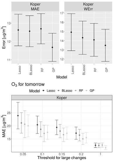 Figure 8 shows the comparison of the Lasso, BLasso, RF, and GP models for the prediction of the daily maximal values of ozone in Koper (tested on 2014–2016 data). On average, according to MAE, the best performing model is GP (see Figure 8 up left), but when observing WErr the GP model does not stand out much (see Figure 8 upper figure on the right). According to WErr, all observed models perform similarly although the GP model exhibits the best performance. Overall RF and GP models show a similar performance when predicting large changes; they both outperform the two linear models, which is not evident when only observing the MAE for all instances. By using our evaluation measures, we can conclude that when it is crucial to carefully predict large changes the non-linear models (RF or GP models) are the best models for predicting ozone in Koper.