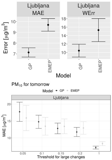 The same evaluation methodology can also be applied to photochemical dispersion models (they are briefly described in Appendix A). As an example, we compare the results of the best performing statistical model for the prediction of PM levels for the next day (t = 2 days) in Ljubljana (GP model) to the predictions of the EMEP MSC-W model [6]. We compare both predictions as point predictions for the same location (modeling point) where the measurements were performed. We selected the EMEP MSC-W model because the results are available online and it is a popular photochemical dispersion model used for the assessment of long-range transport pollution in Europe. The presented example is not intended as a strict comparison of statistical and photochemical dispersion models, nor as a critique of a model type. This is simply a case study on how we can compare the performance of two different types of models as point predictions using the presented methodology. The C(2 days) are calculated as described in Section 2.1.1.