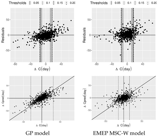 Figure 9 shows similar visualizations to the ones we observed when comparing different statistical models. If we examine the top plots (MAE and WErr) we can conclude that the GP model is a much better performing model than the EMEP model. When analyzing only large changes, we see that as we restrict the observed percentage of the largest changes, the difference between the GP and EMEP models becomes smaller. For only extreme changes, the EMEP model outperforms the GP model. Still, this outperformance of the EMEP model for large changes is not evident in the WErr plot (Figure 9) in the top left. This leads us to question, how is this possible? To further analyze this inconsistency, we visualize our results as proposed in Section 2.3. The top of Figure 10 shows the plots of the residuals against C(2 days) for the two observed models. The changes predicted by the EMEP model sometimes exhibit very high deviation from the observed changes (even when the changes in pollutant levels are small), but in some instances the difference between the actual and predicted changes for very large changes is small. The EMEP model does not underestimate large decreases as consistently as the GP model, but similar to the GP model, generally underestimates large increases. Figure 10 shows C(2 days) against Cpred(2 days) for the observed models. As in the previous figure, the predictions of the GP model show smaller divergence (in this figure this means less scatter around the y = x line). The EMEP MSC-W model contrary to the GP model often predicts an increase instead of a large decrease (points lying on the left of the left dashed line and above the x-axis). It also predicts more increases instead of large decreases as compared to the GP model. By looking at those plots, we can better compare the performance of both models and understand why the MAE for extreme changes (the largest 5%) is smaller for the EMEP model, but when observing WErr the GP model clearly outperforms the EMEP model. Some EMEP model residuals are large when small changes in pollutant levels occur and even if they are weighed with much smaller weights than large changes, they increase WErr substantially. By observing the plots in Figure 9 the performance of the GP model looks much more coherent than that of the EMEP model, especially when observing the bottom plots where the points lie much closer to the line for the GP model.